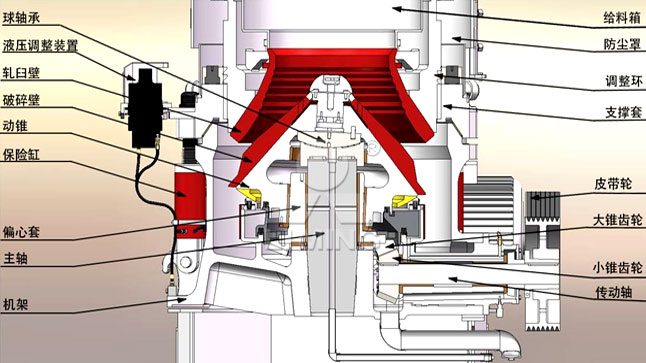 HPT液壓圓錐破碎機主要由機架部、支撐套部、調(diào)整環(huán)部、動錐部、偏心套部、傳動部和保險裝置部七大部件組成,主軸固定,電動機帶動傳動軸旋轉,傳動軸通過齒輪帶動偏心套繞主軸旋轉,再由偏心套帶動動錐部做偏心圓周擺動,從而實現(xiàn)連續(xù)的擠壓破碎石塊。